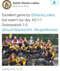 U14 Girls Féile Report: We kicked off our Féile weekend with an impressive win over Killarney Legion FT Austin Stacks 5-6 Killarney Legion 1-1. Played in Connolly Park the Rockettes got some great scores from Heather,Grainne and Nicole to leave the Half Time Score 4-3 – 0-1 in favour of the home side. Legion scored an early goal from a free in the second half but back came the Stacks with a goal from Grainne and points from Ella and Kirby Anne to secure a great win. Next up was Cooraclare and despite some heroics and a never say die attitude we suffered a heavy defeat. Saturday morning at 10.15am we faced our visitors St. Ailbe’s – our very young team dusted themselves down and playing some beautiful football ran out comfortable winners on a score line of Austin Stacks 3-5 St Ailbe’s 3-0. We had now qualified for the Cup Quarter Final and headed to Abbeyfeale to face Downpatrick. Our girls put in a very gutsy display, a beautifully well taken goal by Heather Mac Namara being the highlight of the game but alas we just came up short and our Féile adventure concluded FT Downpatrick 1-5 Austin Stacks 1-1. It is worth noting that the only 2 teams to defeat us over the weekend were the eventual Cup finalists (Downpatrick overcame Cooraclare 0-4 to 0-3 in the final). So take a bow everyone – To Gillian, Anthony, Danny, Pat thank you for your time and effort with the girls. Thank you to Darragh for your enthusiasm, energy and footballing know how. You gave it your heart and soul. To the parents who hosted and supported our club events over the weekend – thank you. Finally thank you to Maurice and Elma for the amazing support you provide to the girls. The amount of time, effort and selfless devotion to the girls is an example to us all. We came so close! The future is bright.