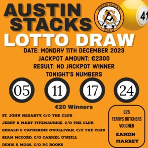 CLUB LOTTO: Thanks to all supporters and sellers of our club lotto tickets: (i) Siopa Chaoimhín de Barra, An Charraig; (ii) Paudie Commane’s Bookshop (PC Books), Rock Street; (iii) O’Flynn Interiors, Rock Street; (iv) Hussey’s Deli and Newsagency, Prince’s Quay; (v) The Burger Shack, Monavalley (vi) Kirby’s Brogue Inn, Rock Street.