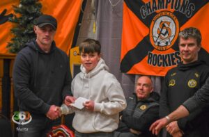 PEIL FAOI 13: The U13 end-of-year medal presentation took place last weekend at the Awards Evening in the clubhouse. An exciting and enjoyable evening drew the curtain down on the boys’ U13 football year. These young stars of The Rock received their hard-earned and well-deserved Town League Division 3 winners medals. What joy for all concerned….players, parents, fans and mentors! In addition Darragh Moriarty, Joe O’Halloran and Billy Kirby received prizes for attending over 90% of training sessions during the year. That’s dedication! Many thanks to Lisa and Annette for the food and refreshments, to Martha Kowalczyk for the photos and to our own great William Kirby for presenting the boys with their medals and awards. We wish the very best of luck to all our boys in their 2024 football endeavours with the U13s or U15s. We wish everyone a very Happy Christmas…Nollaig Shona do chách. And let’s not forget the men behind the scenes: Ciarán, Dan, Donal, Ger, Kieran, Micko and Tim. The 2023Austin Stack Club U13 boys: Albi Gaxha, Billy Kirby, Blake Bowler, Conor Hanafin, Conor Maguire, Conor Murphy, Danny Lane, Darragh Moriarty, David Ahern, Diarmuid Hennessy, Dylan McEvoy, Ediart Topali, Eliot Calleja, Ethan Cushen, Gearóid Corcoran, Gerard Teahon, Harry Maguire, Jayden O’Dowd, Jack Maguire, Joe O’Halloran, John Riordan, Karol Kowalczyk, Kian Cronin, Liam Swords, Luke Kavanagh, Mark Foley, Mark Riordan, Matthew Murphy, Michael Carmody, Noah Reidy, Oisín Horan, Oran O’Regan, Ryan O’Flaherty, Séamus Keenan, Shane Carey, Shea Horan, Tadhg Lucey, Tadhg O’Regan, Tom Dawson, Zac Moore. (Dan Ahern)