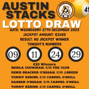 CLUB LOTTO: Thanks to all supporters and sellers of our club lotto tickets and especially to (i) O’Flynn Interiors, Rock Street, (ii) Hussey’s Deli and Newsagency, Prince’s Quay, (iii) The Burger Shack, Monavalley, (iv) Kirby’s Brogue Inn, Rock Street, (v) Siopa Chaoimhín de Barra, An Charraig and (vi) Paudie Commane’s Bookshop (PC Books), Rock Street.