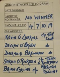 CLUB LOTTO: Thanks to all who support and promote our club lotto: (i) O’Flynn Interiors (Malachy Nagle), Lower Rock Street, (ii) Kirbys’ Brogue Inn, Lower Rock Street, (iii) Husseys’ Deli, Prince’s Quay, (iv) Carmel O’Neill, (v) Maguires’ Butcher Shop, Caherslee, (vi) Barrys’ Supermarket, Upper Rock Street, (vii) Paudie Commane’s Bookshop, Rock Street, (viii) The Burger Shack, Monavalley, (ix) www.austinstacks.ie (x) and/or on https://play.clubforce.com/play_newa.asp?ll_id=X529#Anchor