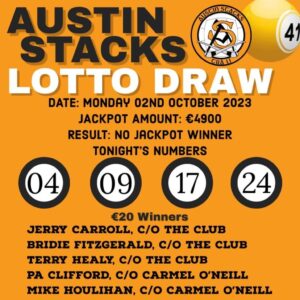 CLUB LOTTO: We appreciate the businesses that support our club lotto: (i) O’Flynn Interiors, The Rock; (ii) Hussey’s Deli and Newsagency, Prince’s Quay; (iii) The Burger Shack, Monavalley (iv) Kirby’s Brogue Inn, The Rock; (v) Siopa de Barra, An Charraig. (i.) Commane’s Bookshop (PC Books), The Rock.