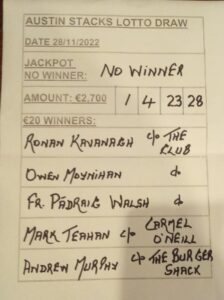 CLUB LOTTO: Thanks to all who continually support and promote our club lotto: (i) Husseys’ Deli, Prince’s Quay, (ii) Carmel O’Neill and others, (iii) Maguires’ Butcher Shop, Caherslee, (iv) Barrys’ Supermarket, Upper Rock Street, (v) Paudie Commane’s Bookshop, Rock Street, (vi) The Burger Shack, Monavalley, (vii) O’Flynn Interiors (Malachy Nagle), Lower Rock Street, (viii) Kirbys’ Brogue Inn, Lower Rock Street, (ix) www.austinstacks.ie (x) and/or on https://play.clubforce.com/play_newa.asp?ll_id=X529#Anchor