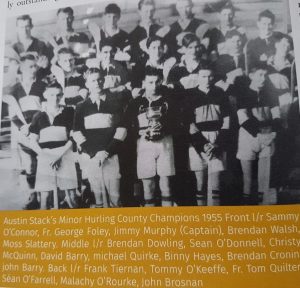 MINORS HURLERS 1955: It was on this day 65 years ago (Sun 4th Sept 1955) that our Minor Hurlers won the Club’s first ever Co. Championship title when they defeated a fancied Ballyheigue outfit in Austin Stack Park on a score-line of 9-4 to 2-2. Many of that team went on to represent the Club at Senior Hurling level during the sixties and early seventies and were the backbone of some great Senior teams that were most unlucky on at least three occasions (1968, 1969 and 1974) not to bring home a Senior Championship title to the Club. The Kerryman report of that 1955 MH Final said Stacks had a very well balanced side composed of some great-hearted triers with an abundance of determination. The Report continued – Star of the side was full back and team captain, Jimmy Murphy and with a leader like him his side just could not lose. Little behind him in defence were Christy McQuinn, David O’Rourke and George Foley. Slattery in goal was safe under pressure.