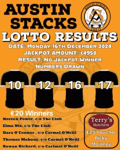 The numbers drawn were 10,12,16,17 and the jackpot of €4950 was not won. The five €20 winners were; Noreen Power c/o The Club, Elma Nix c/o The Club, Dara O’Connor c/o Carmel O’Neill, Thomas Mahony c/o Carmel O’Neill, Rowan Richard c/o Carlmel O’Neill €25 Terrys Butchers Shop Voucher, Ricky Moloney. Next Week’s Jackpot will be worth €5000.