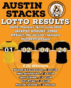 The numbers drawn were 01-02-04-24. The jackpot of €2800 was not won. The €20 Winners were Seanie O’Callaghan c/o Club, Neil Shanahan c/o Club, Jack O’Shea c/o Club, Kay Ryan c/o Club, Rachel Dunne c/o Online. Next draw is on Monday June 23rd at 7.30pm and the jackpot will be €2850. Continued thanks to the following businesses for selling our Lotto tickets on a weekly basis – Kevin Barry’s Shop, Commanes Bookshop (PC Books), O’Flynns Interiors, Hussey’s, Princes St., The Burger Shack, Monavalley and Kirby’s Brogue Inn. And continued thanks to everyone who purchase tickets week-in, week-out.