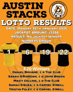 The numbers drawn were 01,06,19,22 and the jackpot of €5200 was not won. The five €20 winners were; Daniel Bohane c/o The Club, Sarah O’Riordan c/o John Breen, Mikey Collins c/o The Club, Sarah O’Shea c/o Carmel O’Neill, Tristin Foley c/o Carmel O’Neill. Next Week’s Jackpot will be worth €5250.