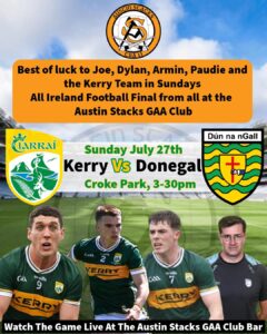 Best of luck to the Kerry Senior Football team and the Austin Stacks players, Dylan Casey, Joe O’Connor, Armin Heinrich and also Austin Stacks Paudie McQuinn who is the Kerry Physio when they face Donegal on Sunday July 27th in the All Ireland Football Final. The game will be shown live at the Austin Stacks GAA Club Bar.