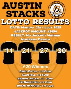 The numbers drawn were 11-21-27-30. The jackpot of €2050 was not won. The five €20 Winners were David Doyle c/o Club, Alan Hill c/o Club, Seamus Walsh c/o Club, Jim Naughton c/o Club, Bryan McMahon c/o Club. Next draw is on Monday July 28th at 7.30pm and the jackpot will be €2100. Continued thanks to the following businesses for selling our Lotto tickets on a weekly basis – Kevin Barry’s Shop, Commanes Bookshop (PC Books), O’Flynns Interiors, Hussey’s, Princes St., The Burger Shack, Monavalley and Kirby’s Brogue Inn. And continued thanks to everyone who purchase tickets week-in, week-out.