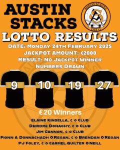 The numbers drawn were 07-19-27-30.The jackpot of €2000 was not won. Our €20 Winners were, Elaine Kinsella c/o Club, Deirdre Donaghy c/o Club, Jim Gannon c/o Club, Fionn & Donnachadh O’Regan c/o Brendan O’Regan, PJ Foley c/o Carmel Quilter O’Neill. Continued thanks to the following businesses for selling our Lotto tickets on a weekly basis – Kevin Barry’s Shop, Commanes Bookshop (PC Books), O’Flynns Interiors, Hussey’s, Princes St., The Burger Shack, Monavalley and Kirby’s Brogue Inn. And continued thanks to everyone who purchase tickets week-in, week-out.