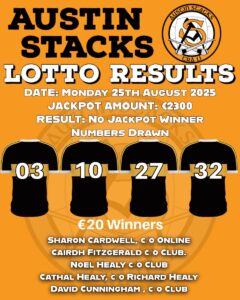 The numbers drawn were were 03-10-27-32.The jackpot of €2300 was not won. The five €20 Winners were Sharon Cardwell c/o Online, Cairdh Fitzgerald c/o ClubNoel Healy c/o Club, Cathal Healy c/o Richard Healy, David Cunningham c/o Club. Next draw is on Monday September 1st at 7.30pm and the jackpot will be €2350. Continued thanks to the following businesses for selling our Lotto tickets on a weekly basis – Kevin Barry’s Shop, Commanes Bookshop (PC Books), O’Flynns Interiors, Hussey’s, Princes St., The Burger Shack, Monavalley and Kirby’s Brogue Inn. And continued thanks to everyone who purchase tickets week-in, week-out.